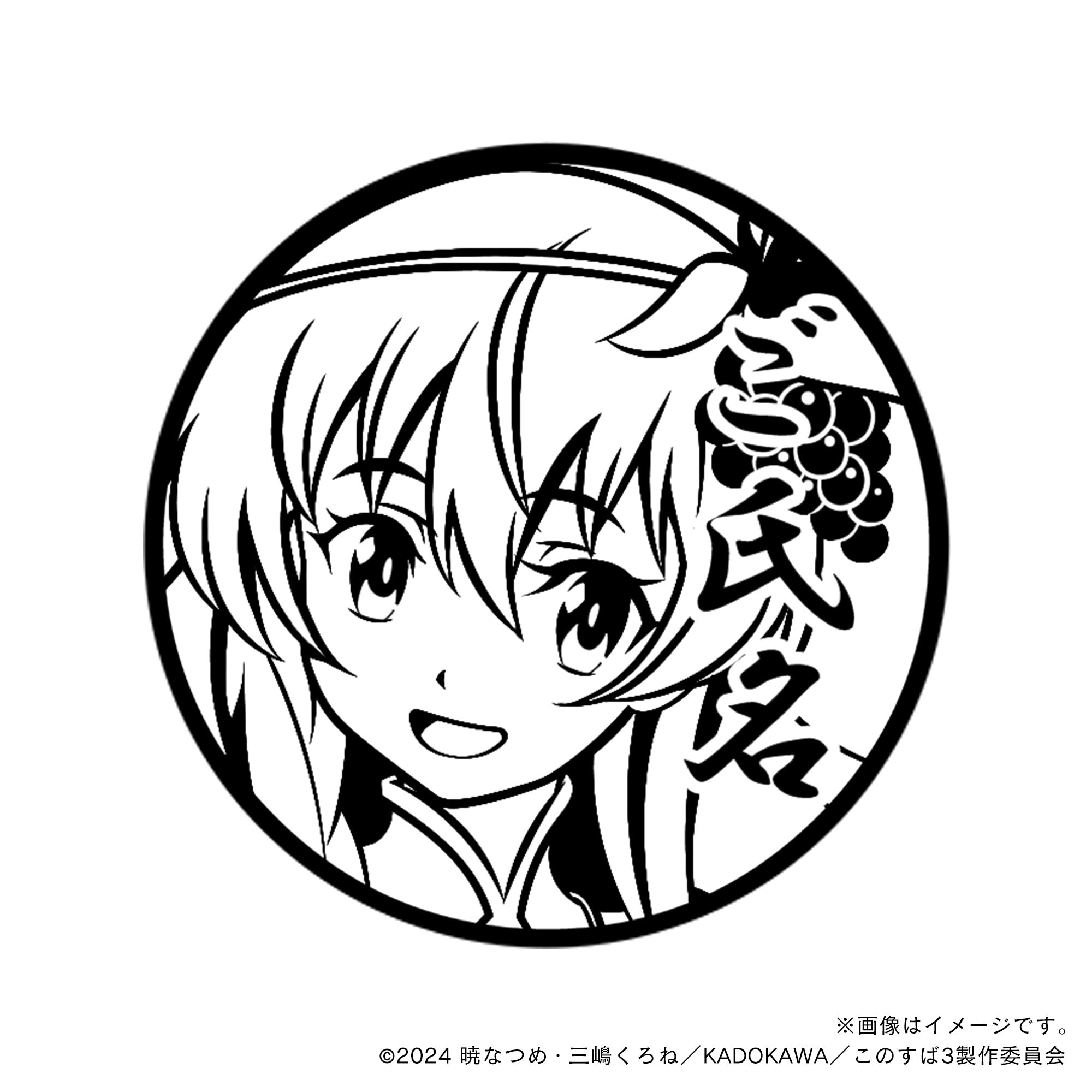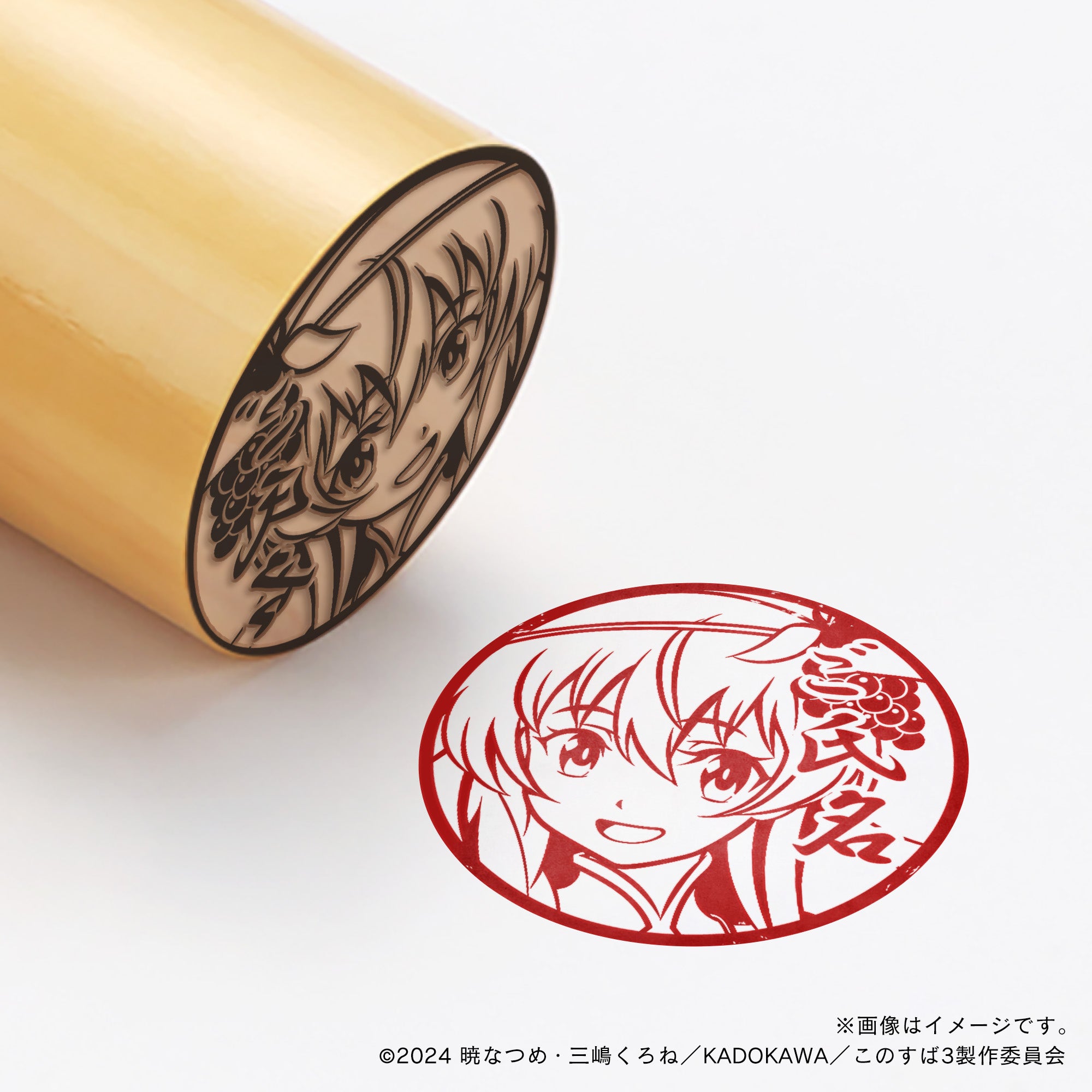 昨年販売された『このすば痛印』から絵柄を一新。今期大活躍のクリス、そしてベルゼルグ王国の第一王女・アイリスが加わっている。名入れには自分の名前だけでなく、キャラクターの名セリフなどを入れて、自分だけのオリジナルグッズに仕上げるのもオススメ。さらに側面彫刻には、めぐみんの使い魔であるちょむすけを使用。ポップな「KONOSUBA」の文字も添えて、飾っても楽しめる可愛い仕上がりに。