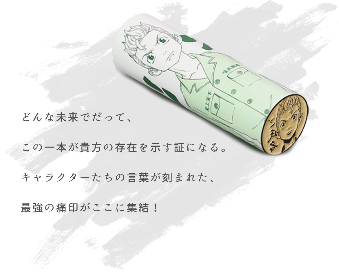 タケミチの「もう二度と譲れねぇモンがあんだよ」という熱い言葉が刻まれた痛印。印面にはお好きな文字を彫刻でき、世界でたった一本の証に。